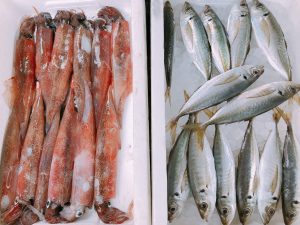 ・アジ、ヤリイカ、紅ズワイガニ、ズワイガニ、活ヒラメ、活ナマコ、小バイ、マダラ